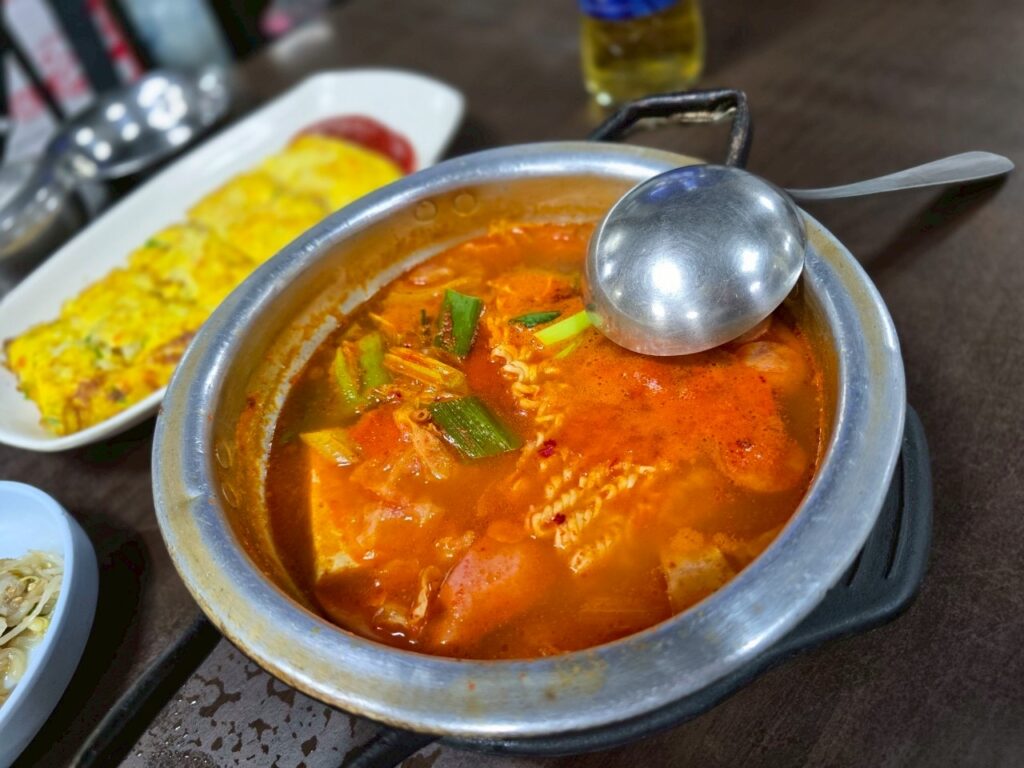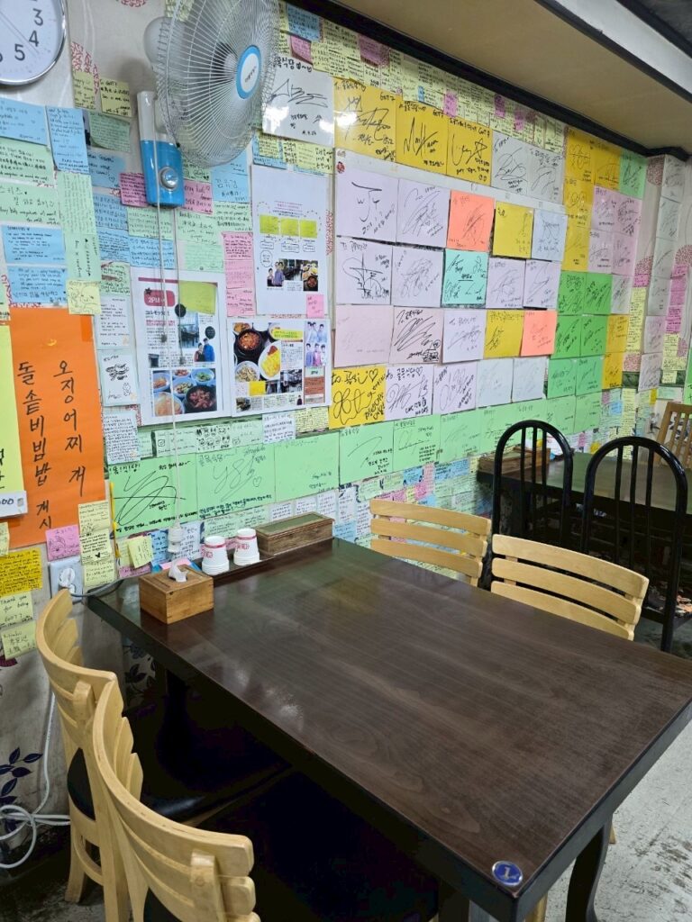 日本で辛ラーメンを使ってプデチゲを良くやるので、本場のプデチゲは少し酸味?もあって新鮮でした。私たちはチビチビ飲みながらランチの人より長居していたのもあって、お客さんが捌けると厨房からオンマが出てきてそこらへんの机で休憩しててちょっと笑えました。