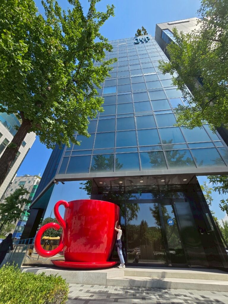 ちゃっかり自分も映り込んで(顔面が見えない程度に)、シンボルの赤いコーヒーカップとJYPのロゴも映る。